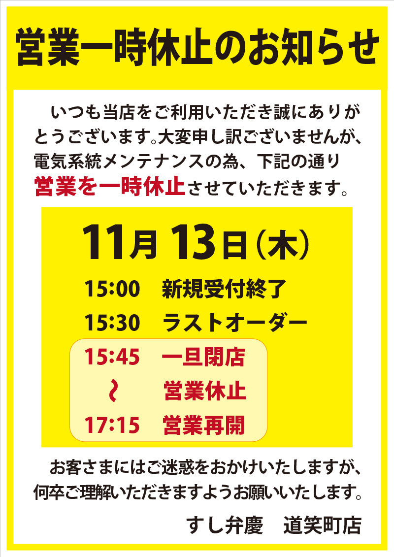 2025年11月13日 道笑町店一時営業休止のお知らせ